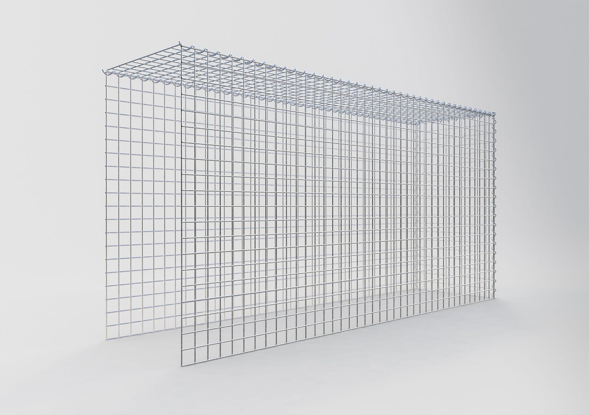 - Hinweis: kein eigenes Bodengitter und kein eigenes Stirngitter – die Verbindung erfolgt über das Deckelgitter und den Verschluss der unteren Gabione sowie den Verschluss der seitlichen Gabione.